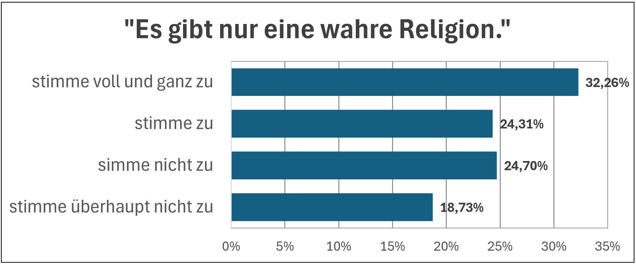 43,4% der Befragten glauben also nicht, dass es nur 1 wahre Religion gibt. Das zeigt zum einen, wie liberal ein großer Teil der Studienteilnehmer ist. Zum zweiten stellt sich die Frage: Was hat dieses Ergebnis denn mit „Fundamentalismus“ zu tun? Der Grundsatz „Christus allein“ ist biblisch und reformatorisch fest verankert. Ist die Evangelische Allianz denn tendenziell fundamentalistisch, weil sie in ihrer Glaubensbasis Jesu Opfertod als die alleinige Grundlage für den Freispruch in Gottes Gericht bekennt?