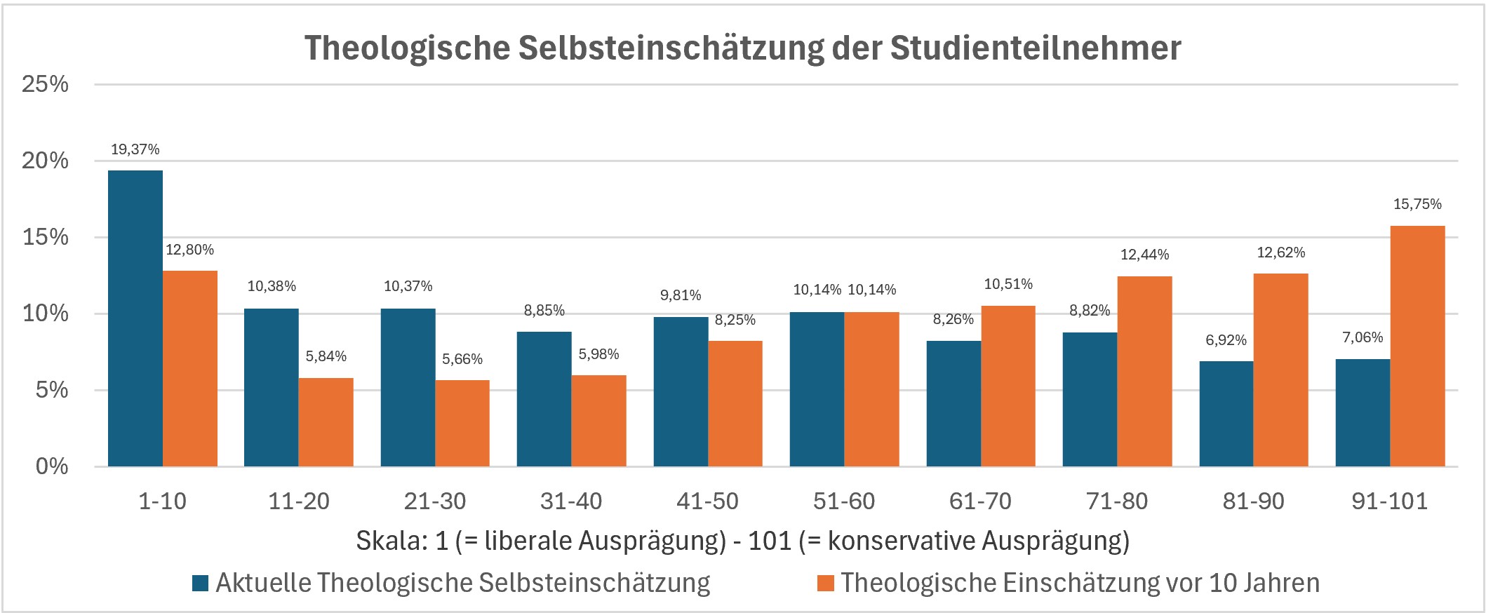 Gemäß der Selbsteinschätzung der Studienteilnehmer sind die Befragten heute – anders als noch vor 10 Jahren – überwiegend theologisch liberal geprägt (FB S.207/208). Gut die Hälfte der ehemals sehr Konservativen ist deutlich liberaler geworden.