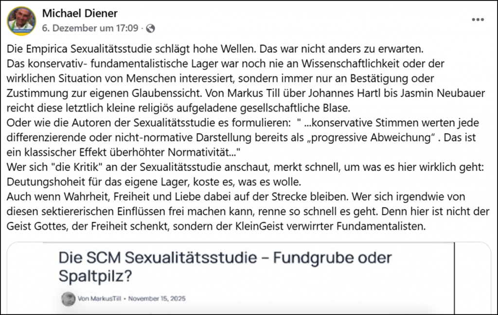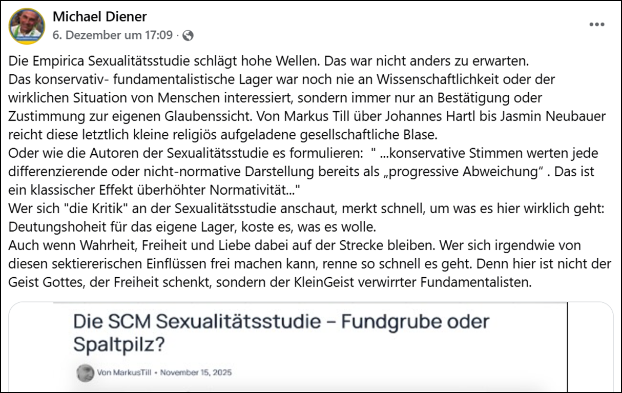 Ich bin verbunden mit vielen Leitern aus unterschiedlichsten Milieus im „evangelikal-pietistischen Umfeld“. Und ich kann berichten: Der Kreis der Kritiker ist vieles, aber ganz sicher nicht klein. Ich wage die These: Das Umfeld, aus dem die Kritik kommt, ist deutlich größer als das progressiv/postevangelikale Milieu, in dem diese Studie gefeiert wird. Trotzdem bleibt die Kritik deutlich leiser als die Studie, die die geballte Medienmacht der zahlreichen Plattformen und Kanäle von SCM nutzen  kann. Alarm und Schmähung sind zudem ganz offenkundig kein spezifisches Merkmal von „konservativen Kreisen“. So schrieb Michael Diener in seinem Facebookpost zur Replik auf den AiGG-Artikel: „Wer sich irgendwie von diesen sektiererischen Einflüssen frei machen kann, renne so schnell es geht. Denn hier ist nicht der Geist Gottes, der Freiheit schenk, sondern der KleinGeist verwirrter Fundamentalisten.“ Mehr Alarm und Schmähung geht kaum.